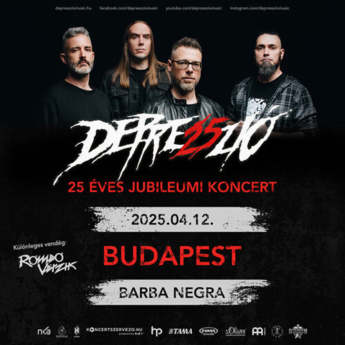 Az április 12-i jubileumi koncert felvezetéseként, április 4-én Dunaszerdahelyen, 5-én pedig Kaposváron lép fel a zenekar. A 25 éves jubileumi turnéra a nyári szezonban kerül sor. Depresszió - 25 Éves Jubileumi Koncert 2025.04.12. Budapest - Barba Negra Red Stage Jegyek