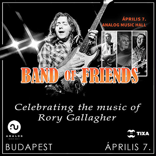 Band Of Friends néven játszanak, de a muzsikájuk sokkal több, mint egy szokványos tribute bandáé. Náluk nem az a cél, hogy egy az egyben előadják Rory felvételeit, hanem hogy megidézzék azt a hihetetlen energiát és szenvedélyt, ami Rory Gallagher dalaiból ma is árad - erről legutóbb 2023 októberében Budapesten is meggyőződhetett a közönség. 40 évvel a legendás magyarországi Rory Gallagher turné után zenésztársai visszatérnek Budapestre és elhozzák a (nemrég Belfastban is szobrot kapott) gitárlegenda legismertebb dalait.