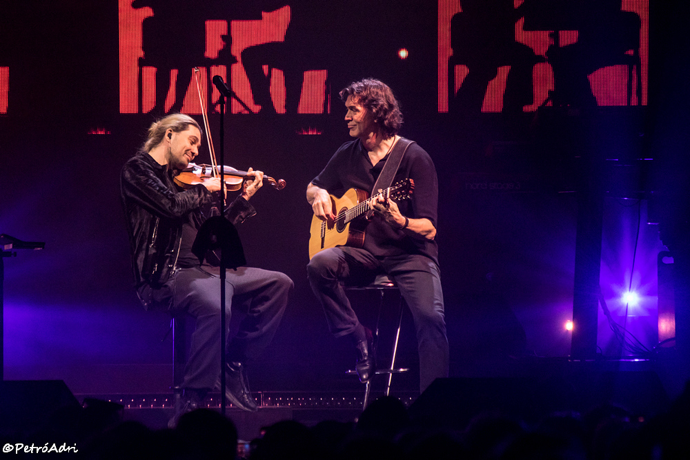 A kivetítőn vonósok árnyékát láthattuk sejtelmes, változatos színekben, a koncert teljes hossza alatt. Nem gondolták ugyan túl, de úgyis Davidre szegeződött minden tekintet, nem volt szükség több vizuális effektre. David egy kényelmes, laza sportos nadrágot viselt, selyemzakóval, imádás, a laza elegancia, ami sugárzik belőle. Sokszor jött le e közönségbe közönség sétára, végig suhanva a nézőtéren, a lelátók egyes részeire is felsétálva hegedülni. Egy kislány mellé le is guggolt pár percig, hogy megcsodálhassa közelről hegedűjét. A küzdőtér másik végén egy rögtönzött kis színpad is be volt rendezve, ahol a koncert második felében több dalt is előadott David és zenekara. Ilyen volt például az Ed Sheeran féle „Shape of you” átdolgozás, ahol fogalmazhatnánk úgy, hogy az intróban David szinte gitározott hegedűjén. A dobos miközben a dobokat „püfölte” ötletesen konfetti szállt fel a dobokról, minden egyes ütemre, jól nézett ki ez az ötletes megoldás, ahogy az apró színes konfettik körbetáncolták a zene ritmusára a zenészeket. Vissza-vissza tért a fő színpadra David, az elég gyors rajongókkal szelfiket is készített (azaz, engedte, hogy készítsenek vele), miközben úgy suhant hegedűjével egyik pontról a másikra, mint „Flash a villám.” Természetesen eközben egy pillanatra sem hagyta abba a muzsikálást.