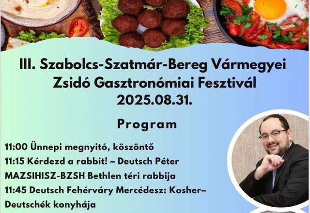 Idén augusztus 31-én ismét megrendezik a Szabolcs-Szatmár-Bereg Vármegyei Zsidó Gasztronómiai Fesztivált a nyíregyházi zsinagógában, ahol a látogatók kiállításmegnyitón, zsidó folklórt bemutató előadáson, interaktív tárlatvezetésen és könyvbemutatón is részt vehetnek - közölték a szervezők az MTI-vel.