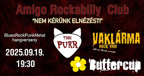 Budapest legendás, több mint 30 éve működő rock & roll és rockabilly klubját szeptember 19-én, pénteken három olyan zenekar bolondítja meg egy csipet metallal, punkkal és blues-zal, akiknek eszük ágában sincs exkuzálni magukat, ha kicsit megremegnek majd a falakon a bakelitek. A „Nem kérünk elnézést” fedőnevű bulin a belváros szívében – a Hársfa utcában – található szórakozóhelyen a punk/rock The Purr, a rock/metal/stoner csajbanda Buttercup, valamint az ütős feldolgozásokkal érkező Vaklárma Rock Trio ad majd koncertet.
