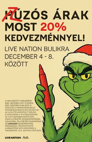 A meghirdetett kedvezmény 2025. december 4-én 12 órától 2025. december 8-án 23:59-ig elérhető, a promócióban részt vevő rendezvények belépőjegyeire, az elérhető jegykészlet erejéig. A kedvezmény a PLX árkategóriák és a VIP csomagok kivételével minden elérhető jegyárkategóriára vonatkozik, és a fizetési folyamatban az LNXMAS25 kedvezménykód megadásával érvényesíthető. A kedvezmény nem vonatkozik a tranzakciós- és a jegykiállítási díjra. További információért irány a www.livenation.hu.