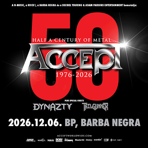 A H-MUSIC, a ROCK1, a BARBA NEGRA, a DECIBEL TOURING és az ADAM PARSONS ENTERTAINMENT bemutatja: ACCEPT 50th Anniversary Tour 2026 2026.12.06. Budapest, Barba Negra Red Stage Vendégek: Dynazty, Tailgunner Kapunyitás: 18:00 Jegyek