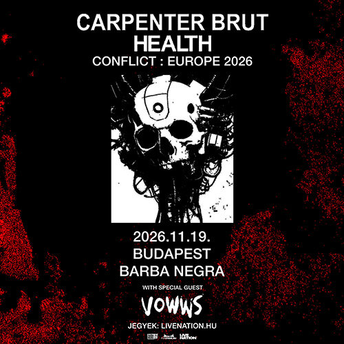 A turnén ráadásul vele tart a Los Angeles-i industrial rock trió, a Health is, akik legutóbb az A38 Hajót mozgatták meg avantgárd hangzásvilágukkal. A zenekar tavaly év végén adta ki Conflict DLC nevű új nagylemezét, amelyen még inkább elmosták a műfaji határokat. Carpenter Brut és a Health vendége a VOWWS lesz, akik misztikus death pop zenéjükből adnak majd kóstolót.