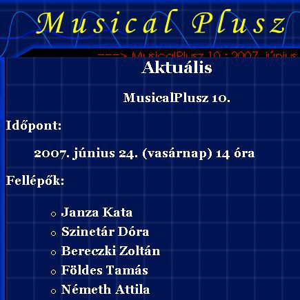 A színházi évad kezdetével ismét megrendezésre kerül a Musical Plusz. A nyári pihenő után fergeteges kezdés várható, ezúttal a Pataky Művelődési Központban. Kezdési időpont 2007. szeptember 29. 15 óra. Ismert és kevésbé ismert tehetségek énekelnek népszerű és méltatlanul a feledésbe vesző musicalekből részleteket.