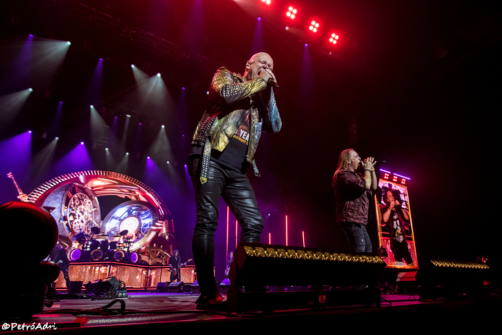 Kis szünet következett, molinót eresztettek a színpad elé, hogy koncert kezdéskor látványos elemekkel tarkítva hulljon le a színpadképet elénk tárva. Gigantikus kivetítő tárult elénk, ahol végig robogtunk a Helloween történelmi lemezein, térben és időben egyaránt, miközben a banda berobbant a színpadra.