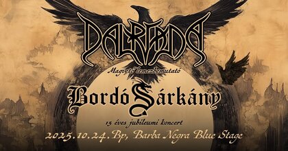 2025 október 24-én közös koncertet ad a Dalriada és a Bordó Sárkány. A Barba Negra Blue Stage-ben a soproni folk metalosok a Magvető albumuk élő bemutatójára készülnek, az öndefinícióban “középkori világzenét” játszó debreceni székhelyű formáció pedig 15 éves jubileumi koncertjét tartja majd a fővárosban - egy nem mindennapi buli várható! A tavaly 20 éves születésnapját ünneplő, a külföldi metal színtéren is elismert, nemzetközi fesztiválokon is rendszeresen szereplő - a 70000 Tons Of Metal hajóra kétszer is meghívást kapott, sőt már Oroszországban és Japánban is turnézó - Dalriada négy évvel az Őszelő után május végén jelentkezett új, 9 dalt tartalmazó nagylemezével. A Magvető címet kapott - egy 48 oldalas tematikus H-Music magazinnal is megtámogatott, a CD mellett vinylen és pendrive-on is elérhető - album megjelenésekor mindkét listán első helyen nyitott a Mahasz Top 40-ben, és azóta is kirobbanthatatlan az élbolyból; ezen az estén erre az anyagra fókuszál majd leginkább a csapat.