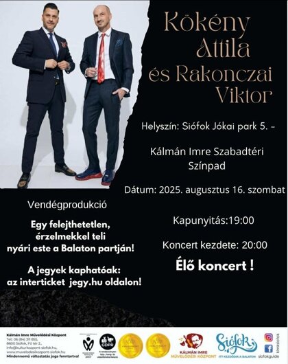 2025. augusztus 16-án két kivételes előadó, Kökény Attila és Rakonczai Viktor közös koncertjén merülhetsz el a lélekig hatoló dallamokban és az élőzenekar varázsában.