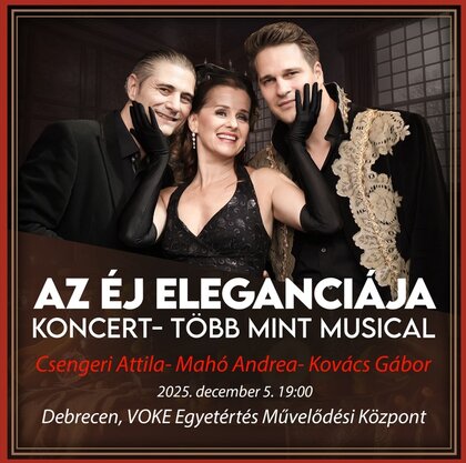 Az Éj Eleganciája több mint musical, egy szenvedéllyel és titkokkal átszőtt utazás. A misztikusan megvilágított falak között életre kelnek a nagy musicallegendák dalai: Az Operaház Fantomja, Rómeó és Júlia, Macskák és olyan világslágerek, melyek úgy simítják meg a lelket, mint egy régen vágyott ölelés. Három varázslatos hang, három művész, akik minden egyes dallal egy újabb szívdobbanást idéznek elő, és bebizonyítják, hogy a szerelem az egyetlen erő, ami túléli az időt… A koncert különlegessége, hogy a backstage-beszélgetések is szerves részét képezik az előadásnak. A három művész valójában három vámpírt alakít, ám a történet nem horrorisztikus, hanem eleganciát, szenvedélyt, romantikát és sziporkázó humort közvetít a közönség felé és arisztokratikus atmoszféra várja a vendégeket.