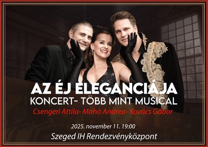 Az Éj Eleganciája több mint musical, egy szenvedéllyel és titkokkal átszőtt utazás. A misztikusan megvilágított falak között életre kelnek a nagy musicallegendák dalai: Az Operaház Fantomja, Rómeó és Júlia, Macskák és olyan világslágerek, melyek úgy simítják meg a lelket, mint egy régen vágyott ölelés. Három varázslatos hang, három művész, akik minden egyes dallal egy újabb szívdobbanást idéznek elő, és bebizonyítják, hogy a szerelem az egyetlen erő, ami túléli az időt… A koncert különlegessége, hogy a backstage-beszélgetések is szerves részét képezik az előadásnak. A három művész valójában három vámpírt alakít, ám a történet nem horrorisztikus, hanem eleganciát, szenvedélyt, romantikát és sziporkázó humort közvetít a közönség felé és arisztokratikus atmoszféra várja a vendégeket.
