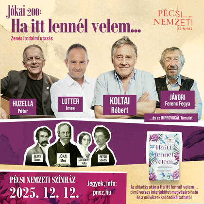 Jókai Mór, a márciusi ifjak egyike, a „nagy magyar mesemondó”, nem mellesleg országgyűlési képviselő, máig a legnépszerűbb magyar regényíró, akinek hatvan esztendőnyi pályáját lankadatlan érdeklődés kísérte. Képzeletének gazdagságával éppen olyan nagy hatást tett, mint stílusának elevenségével és humorával. De milyen volt a fiatal Jókai, Petőfi legjobb barátja, a 8 évvel idősebb Laborfalvi Róza férje? Milyen volt az öreg Jókai, a Petőfi Társaság elnöke, az 54 évvel fiatalabb Grosz Bella férje? És mit történt a két házasság között? Milyenek voltak a reformkori ifjak, különösen Petőfi? Milyen anekdoták lengik körül őket és környezetüket, Szendrey Júliát, Arany Jánost, vagy a belőlük építkező utókort? És milyen hatást gyakorolnak ezek a világklasszis szerzők a mai idolokra, mi az ő történetük? Koltai Róbert bemutatja és megénekli, Jávori Fegya és Huzella Péter zenébe önti, Lutter Imre megkérdezi és tolmácsolja, az Improvokál Társulat eljátssza, méghozzá a Ha itt lennél velem... című verses interjúkötet sorai között. Hab a tortán, hogy a könyv, amelyben az est művészeinek története külön fejezet, az előadás után kedvezményesen megvásárolható és a művészek dedikálják is!