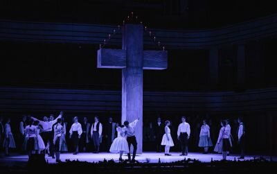 A Magyar Állami Népi Együttes húsvét ünnepéhez illeszkedő táncjátéka a különböző felekezetek liturgiájára éppúgy támaszkodik, mint a Kárpát-medence egymástól távol eső vidékeinek ősi, paraszti népszokásaira és énekeire. Az előadásban a székelyföldi és rábaközi, a felvidéki és dél-alföldi húsvéti rituálék – a kereszténységhez kapcsolódóak és a pogány időszakot idézők egyaránt – egységes színpadi formát alkotva fonódnak egymásba. A Kivirágzott keresztfája izgalmas zenei szövetét nemcsak szokásénekek, népdalok, vallásos népi dallamok és táncmuzsikák alkotják, hanem a jeles napokhoz kötődő egyházi – római katolikus, református, görögkatolikus vagy görögkeleti – énekek, illetve archaikus népi imádságok is. Utóbbiak többsége a régmúltat, a kereszténység felvétele előtti időket is megidézi.