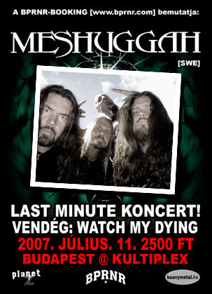 Bár sokan most azt gondolják, hogy egy nagyon rossz ízű tréfa áldozatai, azt kell mondjuk, hogy bármennyire is hihetetlen, de igaz a hír: 2007. Július 11-én, szerdán a modern metalkorszak egyik legjelentősebb zenekara, a svéd MESHUGGAH veszi birtokba a Kultiplex színpadát, prágai és szerb koncertjük közötti szabadnapjukon, amelyet Budapesten szándékoztak tölteni. A koncert vendége a WATCH MY DYING, megjelenés kötelező!