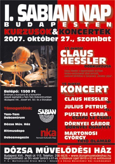 A kanadai cintányérgyártó cég kérésére első alkalommal rendezzük meg ezt a napot, melyen kiállítást, kurzust és koncertet láthatnak vendégeink. A Sabian reprezentánsai - Dave Weckl, Jojo Mayer, Mike Portnoy, Vinnie Paul, Jack Dejohnette, Jeff "Tain" Watts, Claus Hessler, Thomas Haake, Terry Bozzio stb. - között ettől az évtől két magyar neve - Dörnyei Gábor, Martonosi György - is megtalálható.