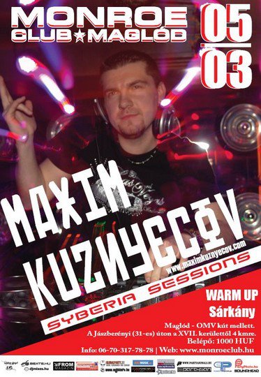 Május 03-án, szombaton, a Monroe az orosz nagytestvér fővárosában, Moszkva szívében született fiatal progresszív dj-producert, Maxim Kuznyecovot látja vendégül. Maxim zenéjét erősen meghatározzák nemrégiben tett moszkvai utazása során tapasztalt orosz zenei hatások és az orosz dj-producerek munkái. Mostani szettjének legfőbb védjegyei a könnyed, vidám dallamok-vokálok és az odakint tomboló elektrós hangzás végletekig eltorzított, súlyos, szakítós basszusai. Syberia Sessions márkaneve amely egyrészt utal orosz származására, illetve a jegesen kemény progi ütemekre, 2004 óta már 9 mixet és számtalan fergeteges klubestet ért meg, melyek egyre nagyobb népszerűségre tettek szert!