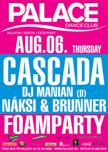 Csütörtökön, augusztus 6-án a Palace-ban vendégeskedik a világhírű német popcsapat, a Cascada (D) egyik tagja, DJ Manian. Visszatérő vendégről van szó, a lemezlovas évek óta imádja a siófoki éjszakákat. A magyar színeket Náksi és Brunner képviselik. Mindemellett habpartival és egyet fizet kettőt kap Bacardi Coke akcióval is várunk. Belépő: 3000 Ft