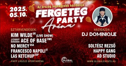 A Fergeteg Party-Aréna az ország legnagyobb házibulija a 80-as, 90-es és 2000-es évek legnagyobb slágereivel, külföldi világsztárokkal és hazai kedvencekkel várja a retro zene szerelmeseit egy öt órán át tartó fergeteges buliba! Az este egyik csúcspontja a 80’-as évek egyik legkiemelkedőbb előadója, Kim Wilde, aki egy 40 perces élő koncerttel fogja elvarázsolni a közönséget. A 90’-es évek legendás formációja, az Ace of Base is visszatér, hogy felejthetetlen élményt nyújva egy hatalmas bulival idézze fel a régi idők hangulatát. A 2000-es évek hangulatát a Las Ketchup hozza el. Olaszország lírikus dallamait Francesco Napolitól hallhatjuk, a magyar előadók közül Zoltán Erika, Soltész Rezső, Dobrády Ákos (TNT), Novay Gábor (Hungária), Végvári Ádám (Neoton), a HAPPY GANG, St. Martin, Marcellina, az AD STUDIO is fellép. A rendezvény házigazdája és megálmodója: DJ DOMINIQUE