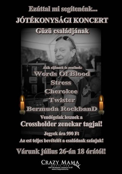 A nemrégiben, tragikus körülmények között elhunyt Gondosch „Güzü” János családjának a megsegítésére szerveznek segélykoncertet július 26-án, szombaton a Crazy Mamában. Az est teljes bevétele a hátramaradott és nehéz helyzetbe került család támogatására lesz fordítva, ahogy a koncert Facebook eseményébe kiposztolt Crossholder relikviák is. A koncert előtt, alatt és után lehetőség lesz csillámtetoválás és henna motívumok elkészíttetésére is, melynek bevétele szintén a családot illeti majd. Ezen az estén olyan zenekarok lépnek színpadra, akik valamilyen formában kötődtek Güzühöz, akár közös munka, vagy barátság útján. Az öt fellépő zenekar: Words of Blood, Stress, Cherokee, Twister és a Bermuda RockbanD, de színpadra lépnek a Crossholder zenekar tagjai is, egy-egy produkcióban.
